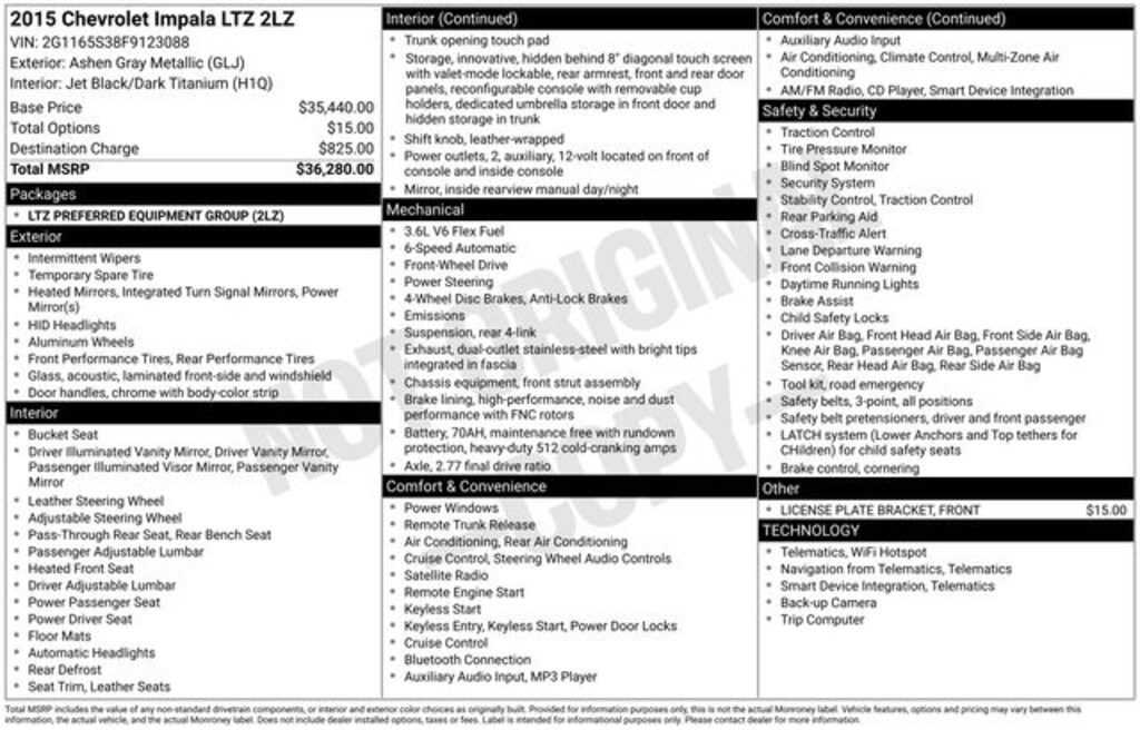 Fully equipped yet clean and powerful, this car demonstrates the pleasure potential of the modern automotive technology! Chevrolet prioritized practicality, efficiency, and style by including: adjustable headrests in all seating positions, tilt and telescoping steering wheel, and a blind spot monitoring system. A 3.6 liter V-6 engine pairs with a sophisticated 6 speed automatic transmission, and for added security, dynamic Stability Control supplements the drivetrain.